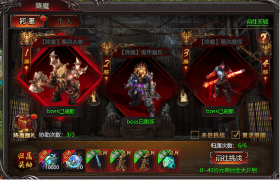 4、BOSS死亡时,地图内与归属者同行会的玩家,可消耗协助次数并获得协助奖励,协助奖励固定为5000降魔令;