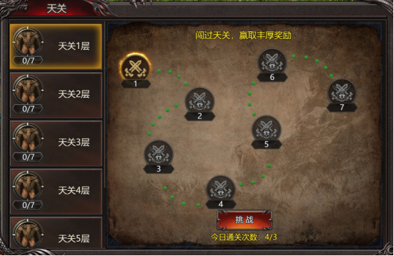 天关每天可挑战3次,每一层天关都有7个BOSS,第一层7关打完才能进入第二层。闯过天关即可拿丰富的强化石,经验丹,元宝,盾牌碎片等道具。