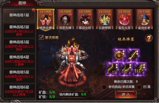 2. 兽神BOSS为个人归属,玩家每天有3次归属,每天0点刷新,当天未用完的次数次日可叠加,最多叠加至9次