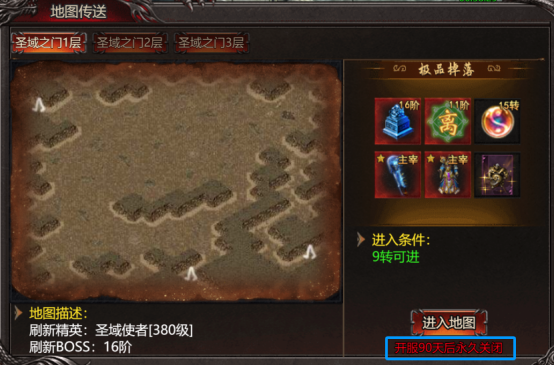作为初始地图进入的条件非常简单,也是完成主线任务的主要地图。不同的地图要求不同,有要求等级转生,攻击,龙魂等,我们可以根据自己的能力进入地图。当然,作为陪伴我们成长的地图,在开服达到一定的天数后会永久关闭!主线任务一定要坚持完成,地图关闭后主线任务就不能再完成了。