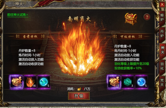 2、随着神火等级的提升,会拥有更强大的特权效果。当神火淬炼到太阳真火(3级)时,可以激活丹炉的自动放入和自动收获功能。