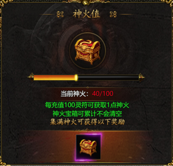 4、每充值100灵符可以获得1点神火值,累积获得100点神火值后,可以点击右上角的宝箱图标开启一次神火宝箱,获得丰厚的奖励。