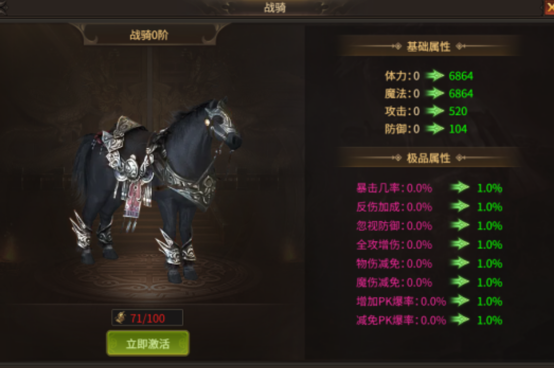 2. 战骑提供大量基础属性加成,同时附带极品属性加成,可大幅提升角色战斗与PK能力。