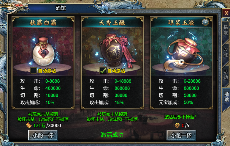琼浆玉液可谓是最有效的狂暴功能,不仅属性比前两类酒激活后的属性高