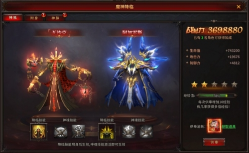 2)消耗神魂觉醒卷轴可觉醒魔神神魂获得大量属性加成及强力战斗技能,提升降临技能效果