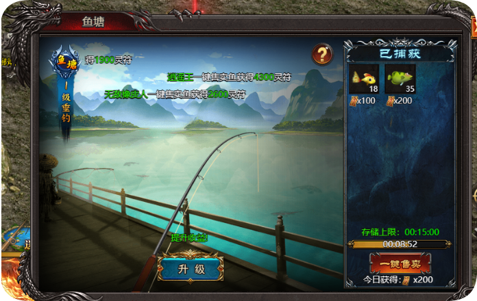 大家提升鱼塘等级后,可以活动攻魔道、双防、生命的属性效果,而且还能提示存储时间上限。