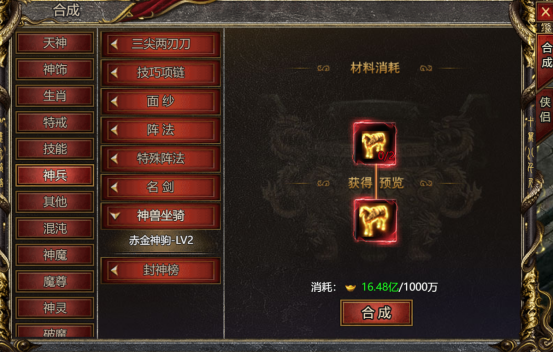 2、合成系统:通过合成系统,将两个完全相同的神兽坐骑进行合成,可以得到更高一级的神兽坐骑。合成需要消耗大量的元宝,合成成功概率为百分百。